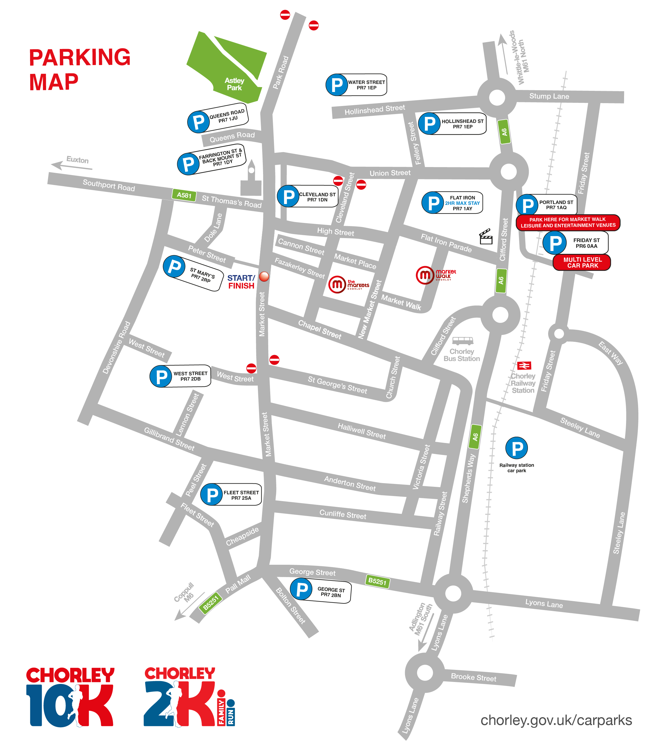 Race pack collection: If you registered before 21 April, you can collect your personalised event pack (which includes your bib number) in advance from All Seasons Leisure Centre (Water Street, Chorley PR7 1EX) between noon on Monday 27 April and 6pm on Friday 1 May. Collection times 7am to 9pm.